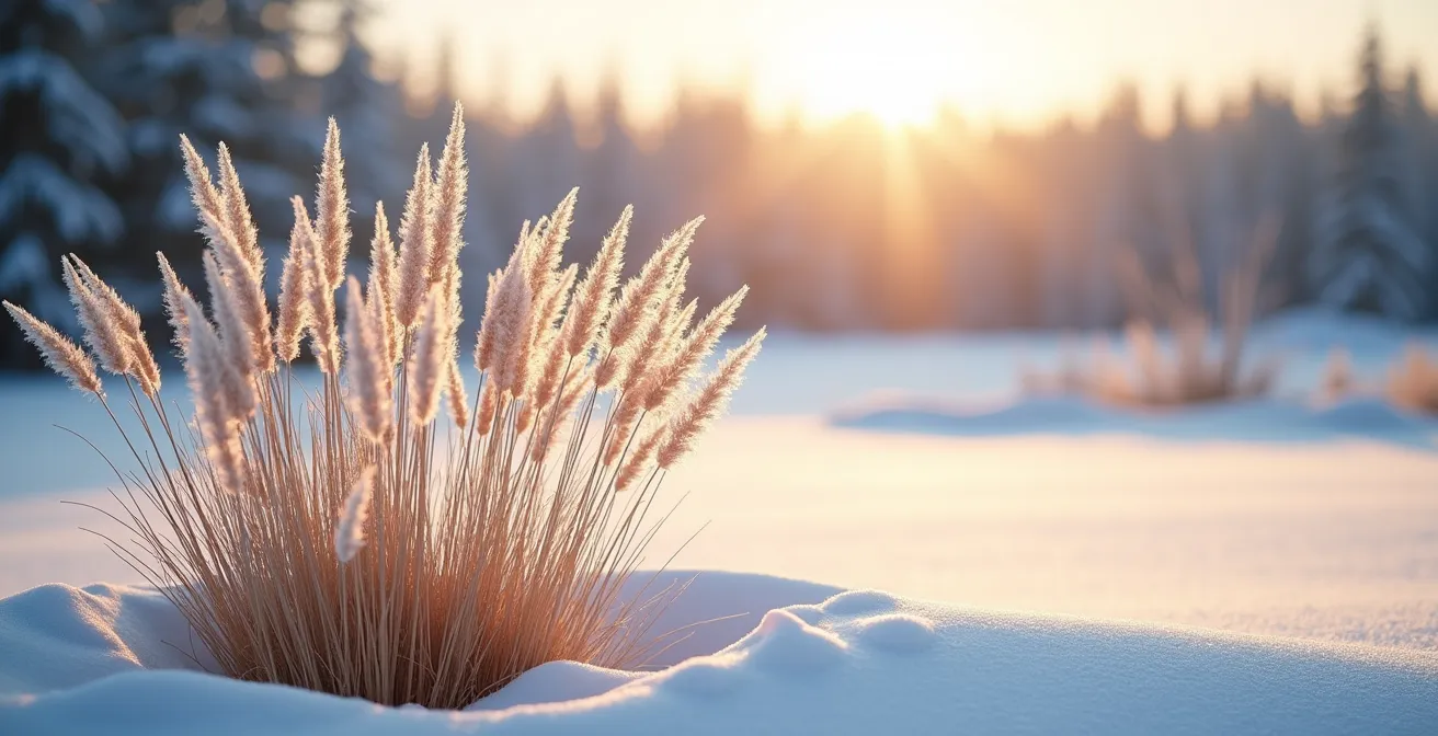 L’une des erreurs les plus fréquentes, dictée par un réflexe de « nettoyage » automnal, est de tailler les graminées ornementales au ras du sol avant l’hiver. C’est se priver de l’essence même de leur contribution au jardin : le spectacle hivernal. Le feuillage séché, qu’il soit blond, cuivré ou argenté, capte la lumière basse du soleil d’hiver d’une manière qu’aucune autre plante ne peut égaler. Les épis se couvrent de givre, créant des sculptures éphémères d’une beauté délicate. Le son du vent qui bruisse à travers les tiges sèches ajoute une dimension sonore, une présence vivante dans le silence de l’hiver. Comme le partage une lectrice du blog Jardinier Paresseux, « J’adore la graminée Karl Foster… j’aime son allure en plein hiver à regarder de ma fenêtre du salon ».