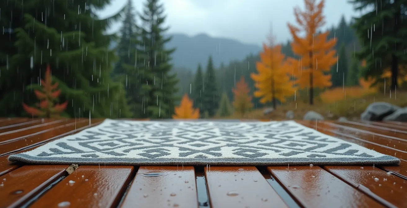 L’erreur la plus coûteuse qu’un propriétaire puisse commettre n’est pas de choisir le mauvais tapis, mais d’ignorer la surface sur laquelle il est posé. Placer un tapis, même en polypropylène, directement sur une terrasse en bois traité ou en cèdre est une invitation au désastre. Après une averse, le tapis retient une fine couche d’humidité contre le bois. Sans circulation d’air, cette humidité stagnante crée un microclimat idéal pour le développement de moisissures et de champignons qui attaquent et font pourrir les planches. Le tapis semble sec en surface, mais en dessous, un processus de décomposition lent et destructeur est en marche.